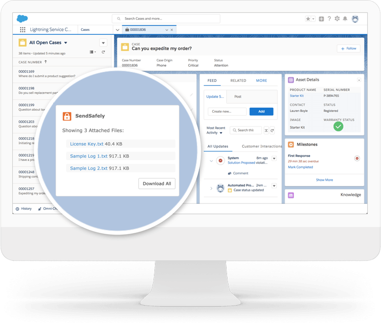 For companies that use Salesforce, our native app lets support agents send and receive encrypted files of any size. Install the app for free from the Salesforce AppExchange.