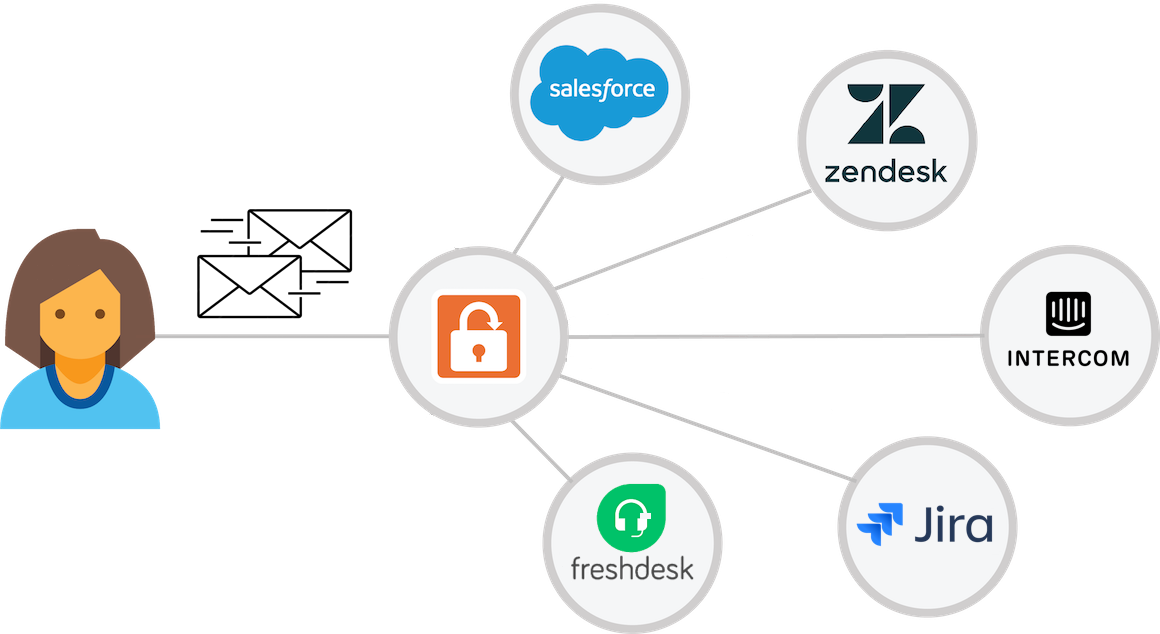 The SendSafely Serverless Email Gateway (SEG) can be used to automatically intercept and encrypt customer emails containing sensitive content and un-encrypted attachments bound for third party service platforms such as Salesforce, Zendesk or Freshdesk. Use the inbound SEG to keep your customer’s emailed secrets out of your service desk.
