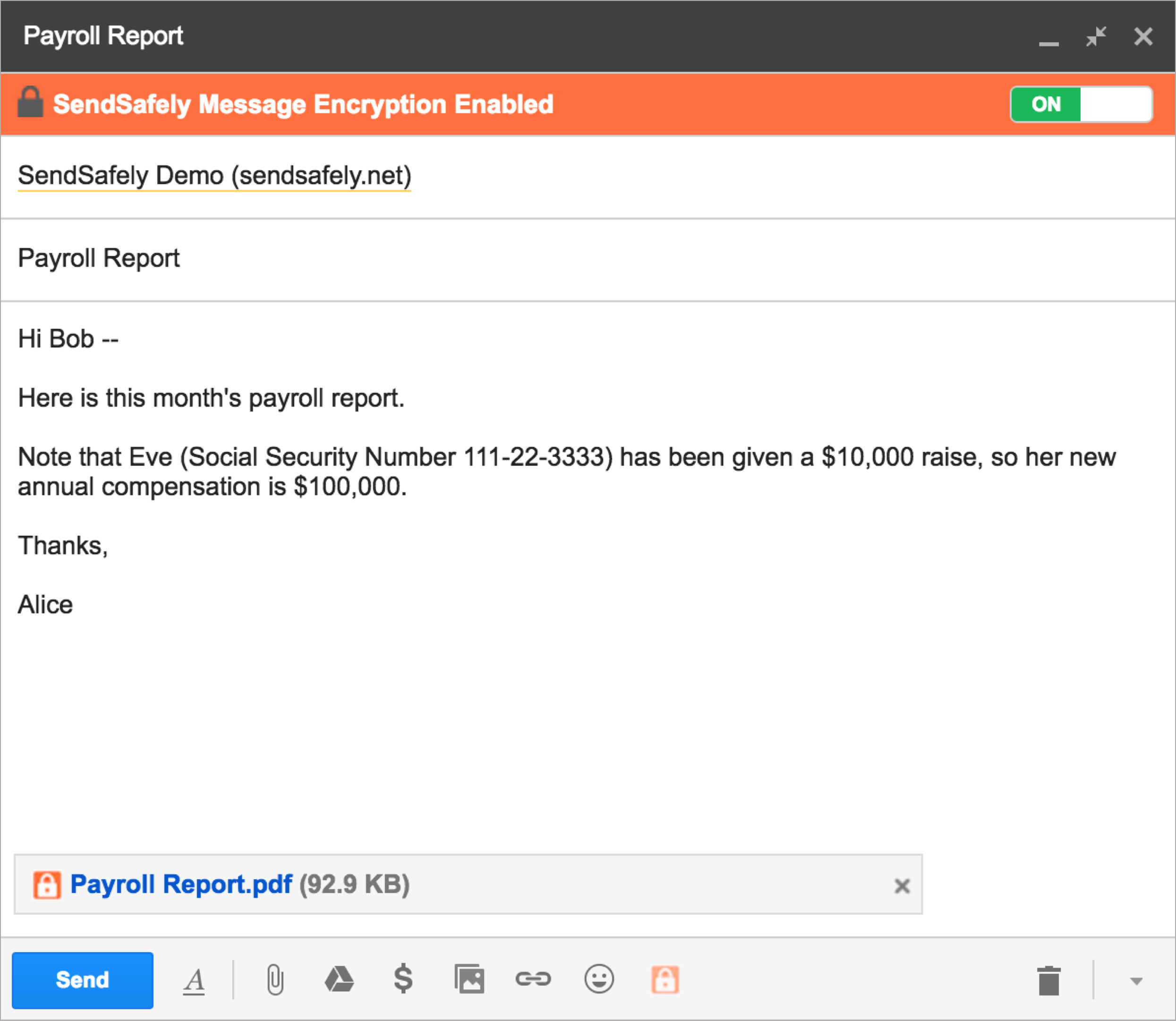 For companies that use Google Apps for Business, our Chrome Extension integrates SendSafely with Gmail. Users can encrypt entire email messages and add encrypted files to any email message directly from the Gmail compose window.
